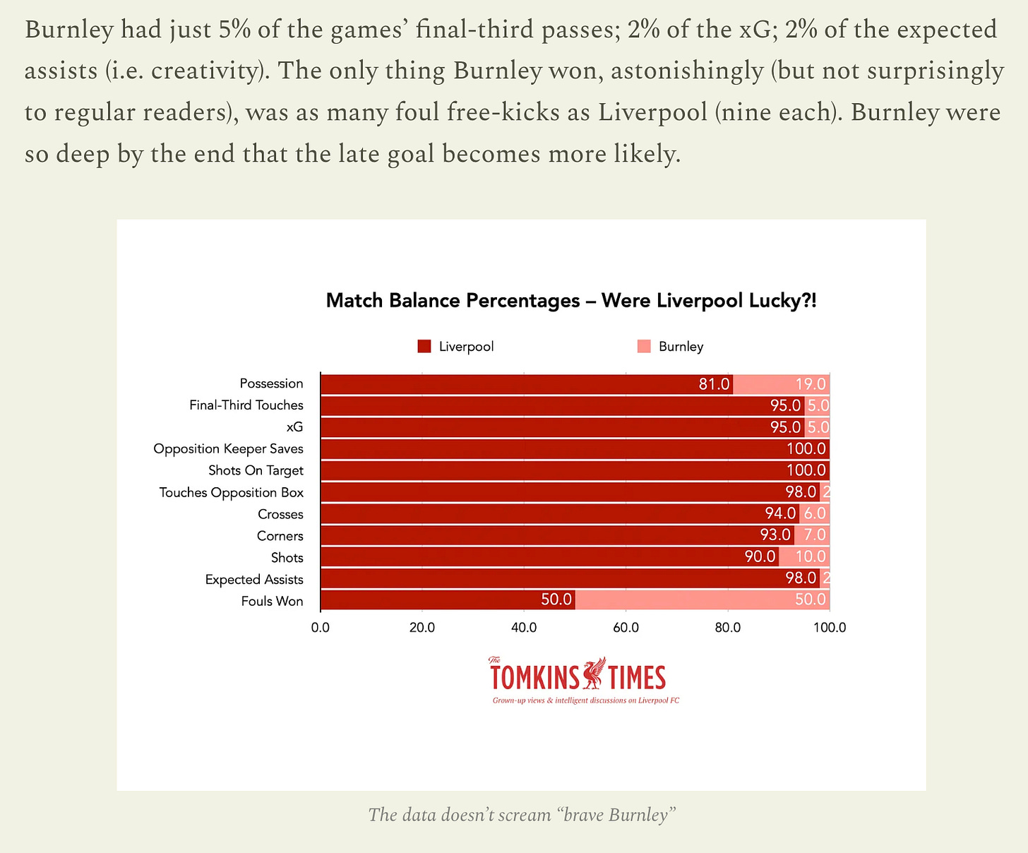 Even my beloved Liverpool’s scrape the week prior against Burnley told the same story: huff and puff, twenty-seven shots, a last-minute penalty winner, and pundits insisting Burnley deserved more. Statistically, they could have played 100 matches and never scored. Brave graft, maybe. Beautiful? Hardly.